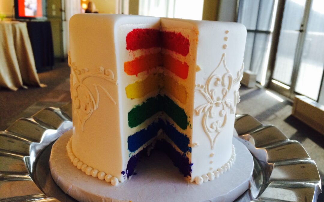 Just like everything else we do #custom – we created a custom theme for the event, using the rainbow symbol as inspiration. We made a 7 layer, ROYGBIV wedding cake, with white icing and those beautiful colors inside, with each layer separated by icing! Picture to the right.